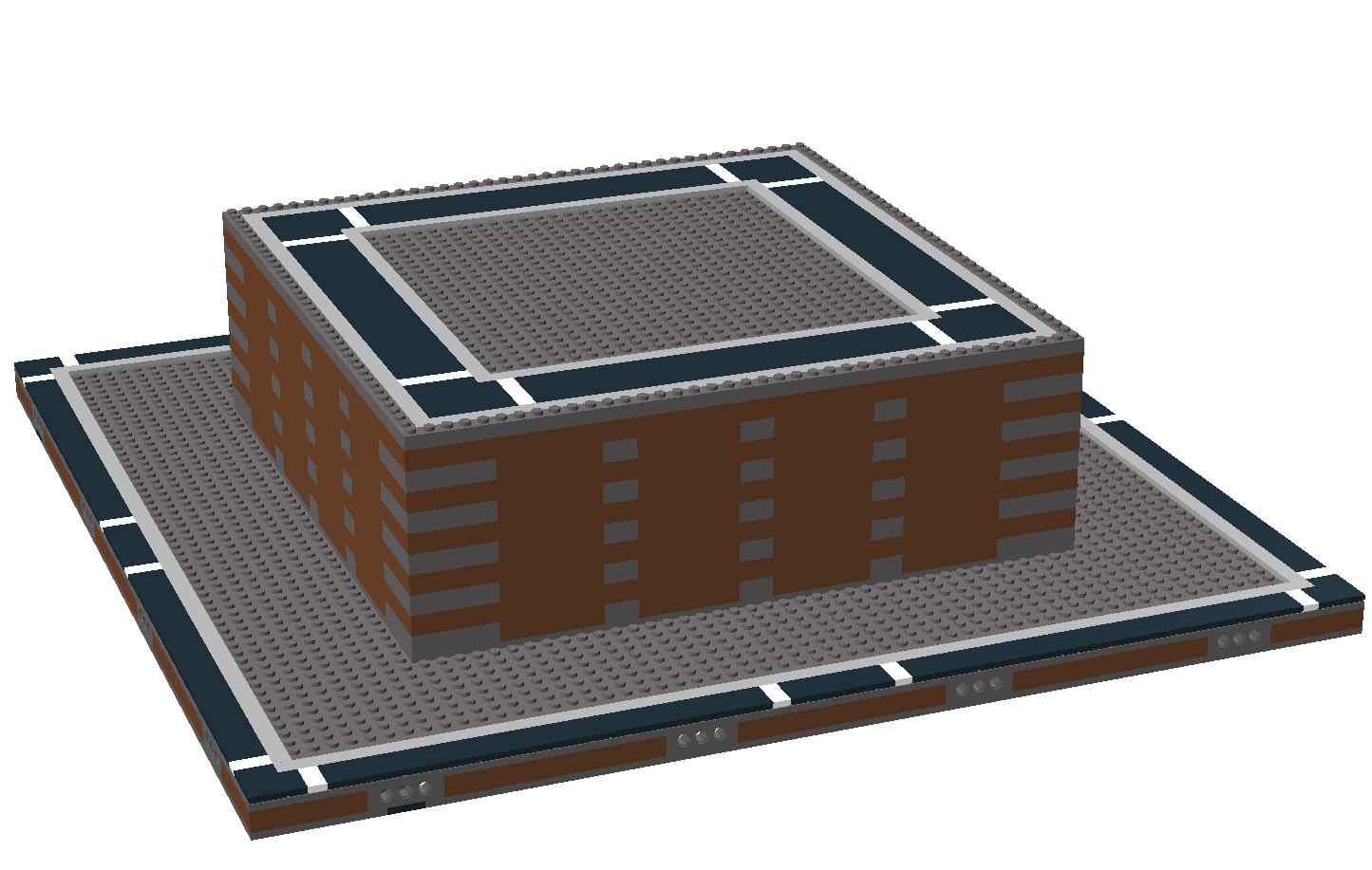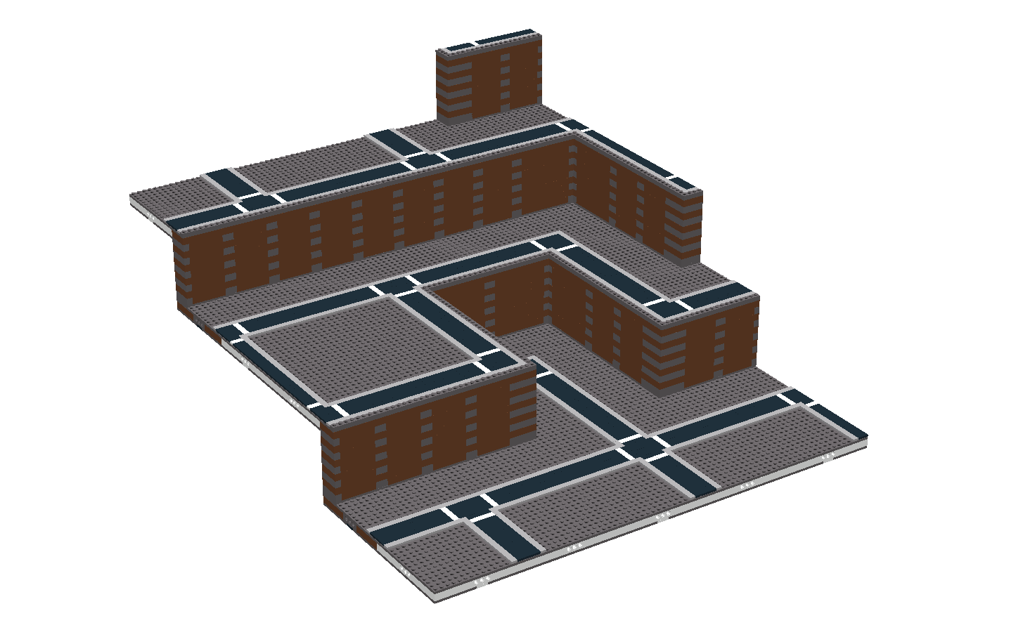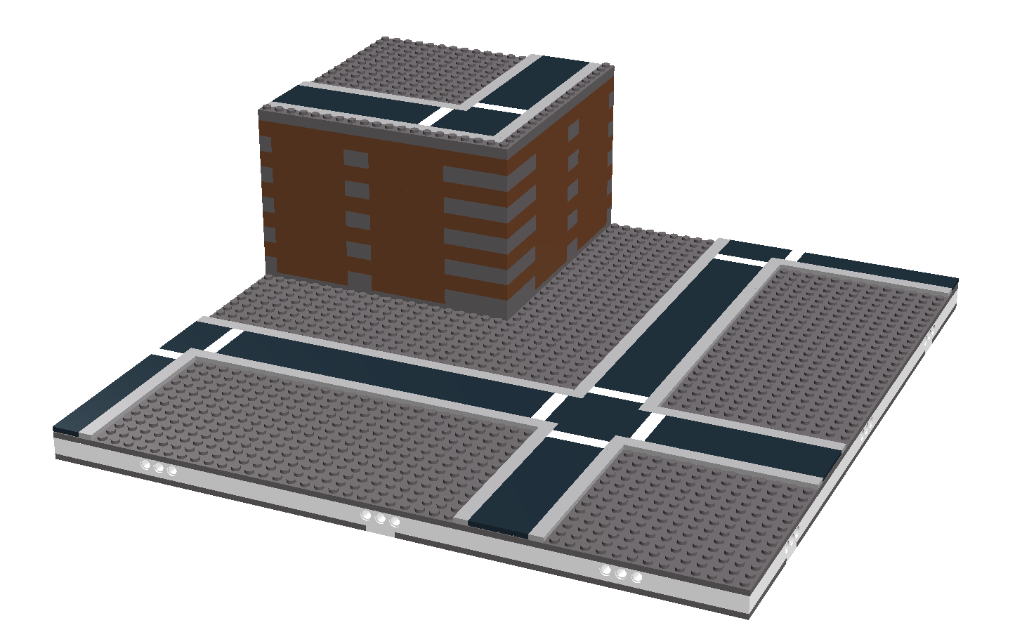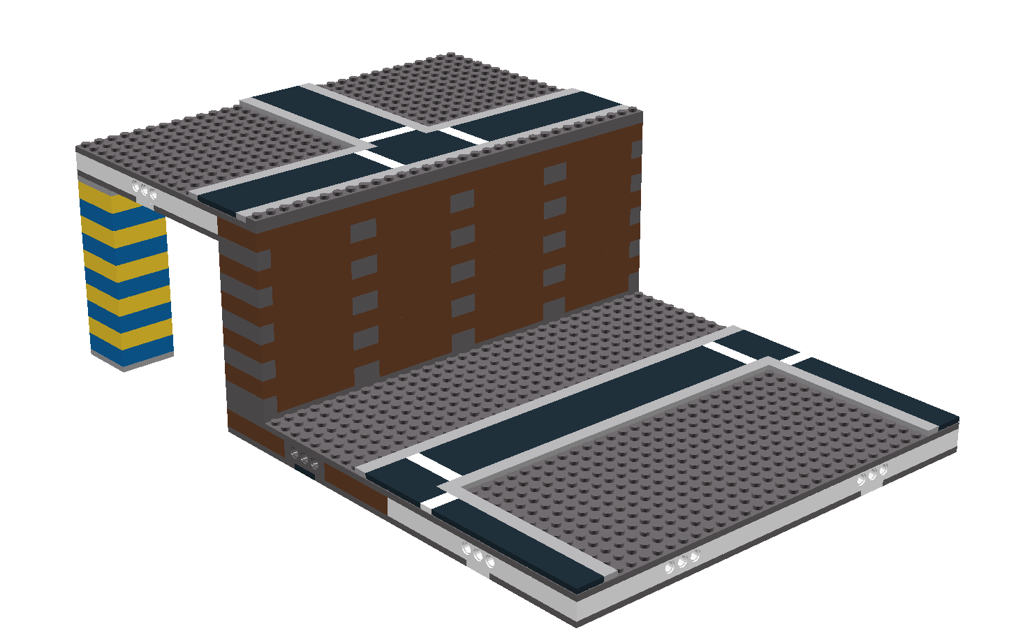 The Bluff modules are built by adding a stack of bricks and plates to one or two sides and one to three corners of a base module to create raised section where other Micropolis modules can be connected to form varied terrain in the layout. The stack consists of 1 plate, 10 bricks, and 2 plates over the top plate of the module base sandwich. The height of the module at the upper road section should be 12 bricks and 2 plates, or 38 plates. The minimum depth of the raised section of the module is 4 studs.