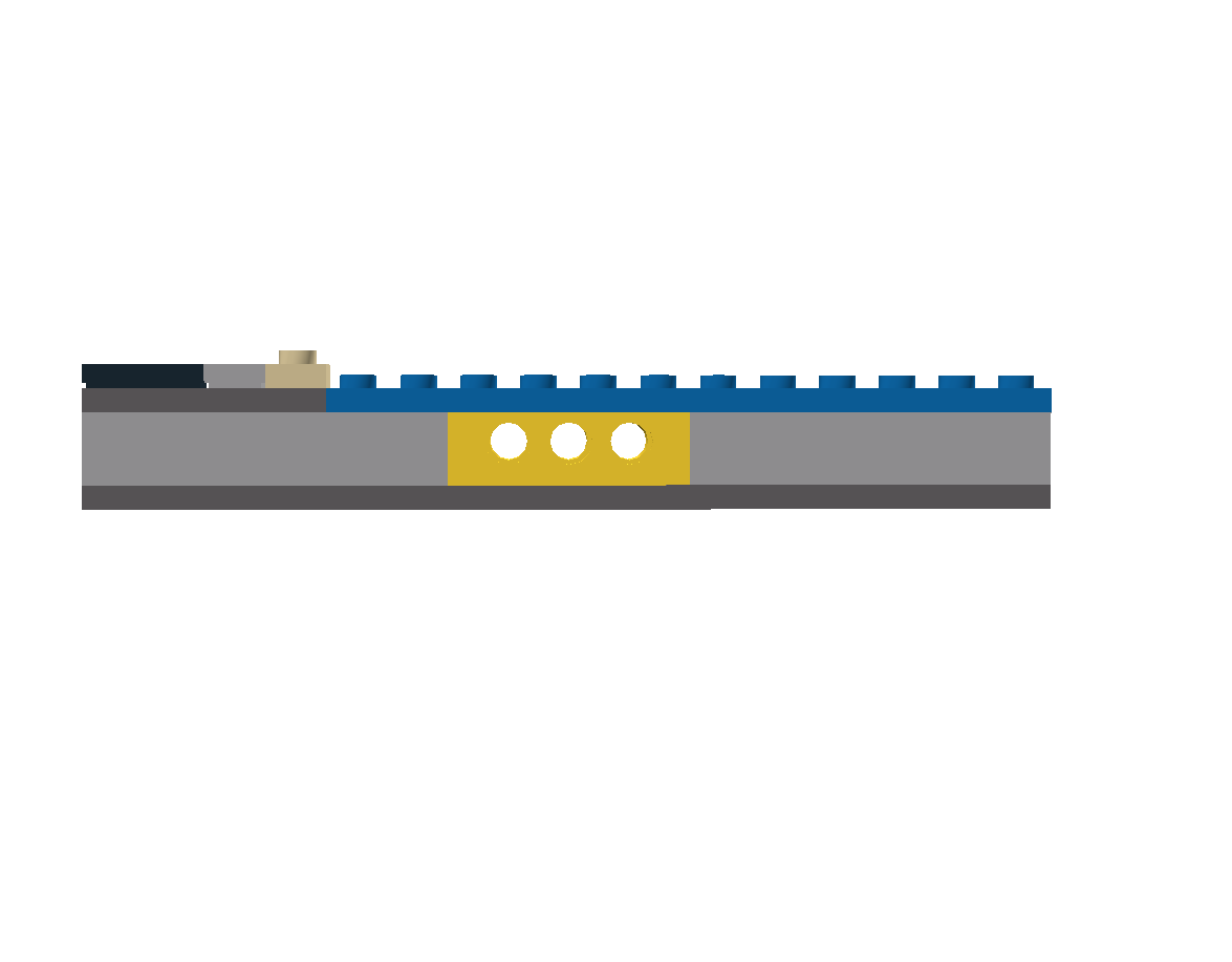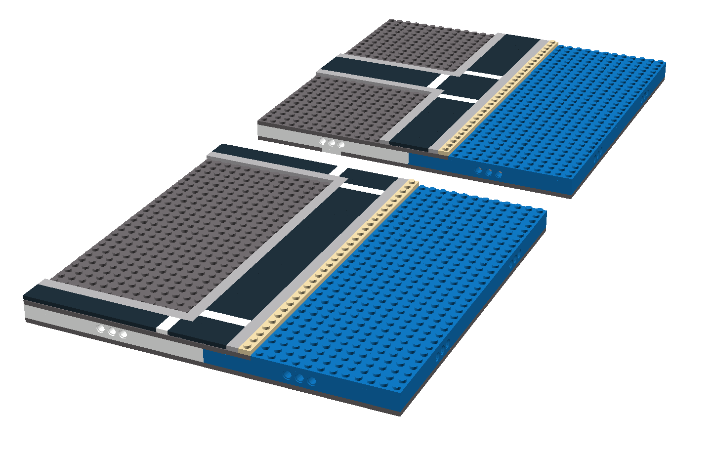 For all Waterfront modules the "water" is the top layer of plates in the module base sandwich immediately over the brick layer and must be Bright Blue in color. This puts the water level one plate below the level of the roads and sidewalks in the base modules. The outer stud at the water level must not be covered to allow for a consistent water level between Waterfront modules. For all Waterfront modules that border non Waterfront modules the first two studs along that side are standard road, the third stud is standard sidewalk and the fourth stud must have at least one plate in height in any appropriate color. This provides a consistent look from module to module along the waterfront.